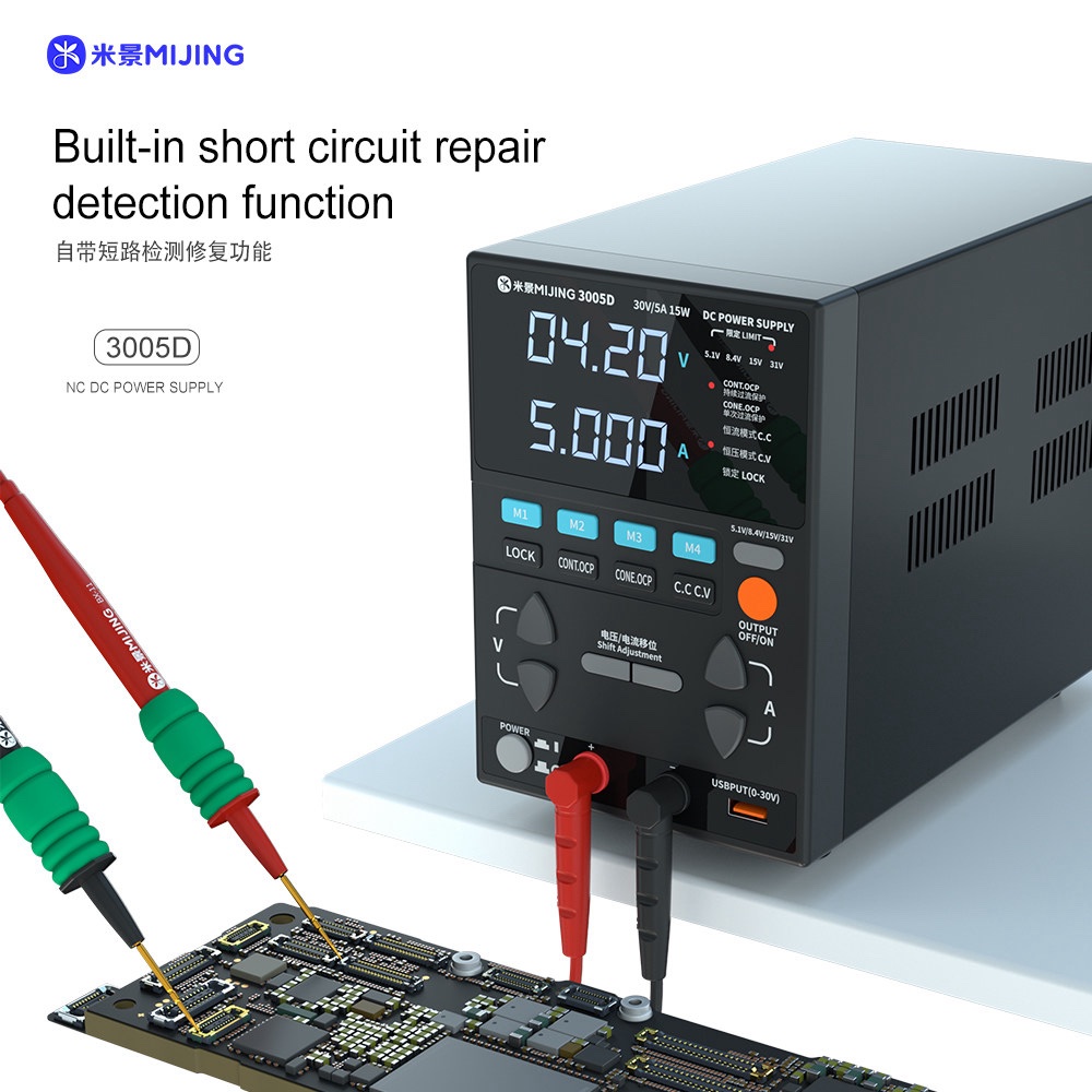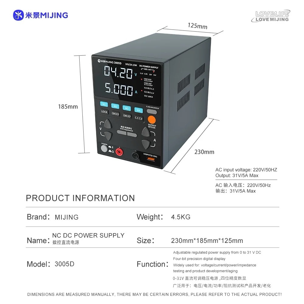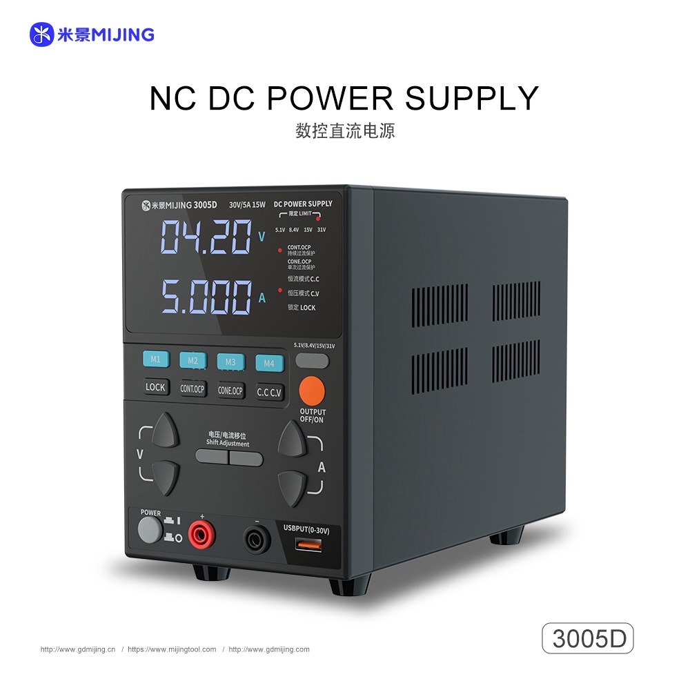 The MIJING 3005D NC DC Power Supply 31V/5A Max Output USB Fast Charging Adjustable Voltage Regulator Bench Switching Power Supply is designed for efficiency, offering a maximum output of 31V and 5A. This performance level ensures that it can meet various electronic project demands, providing stable power for your applications.