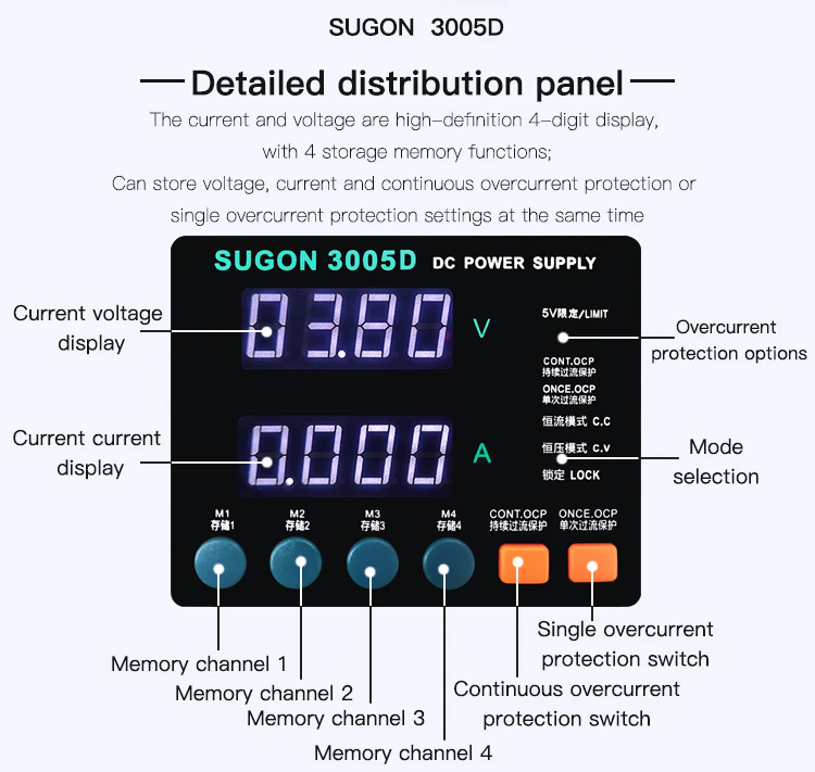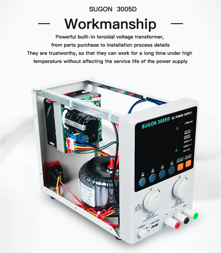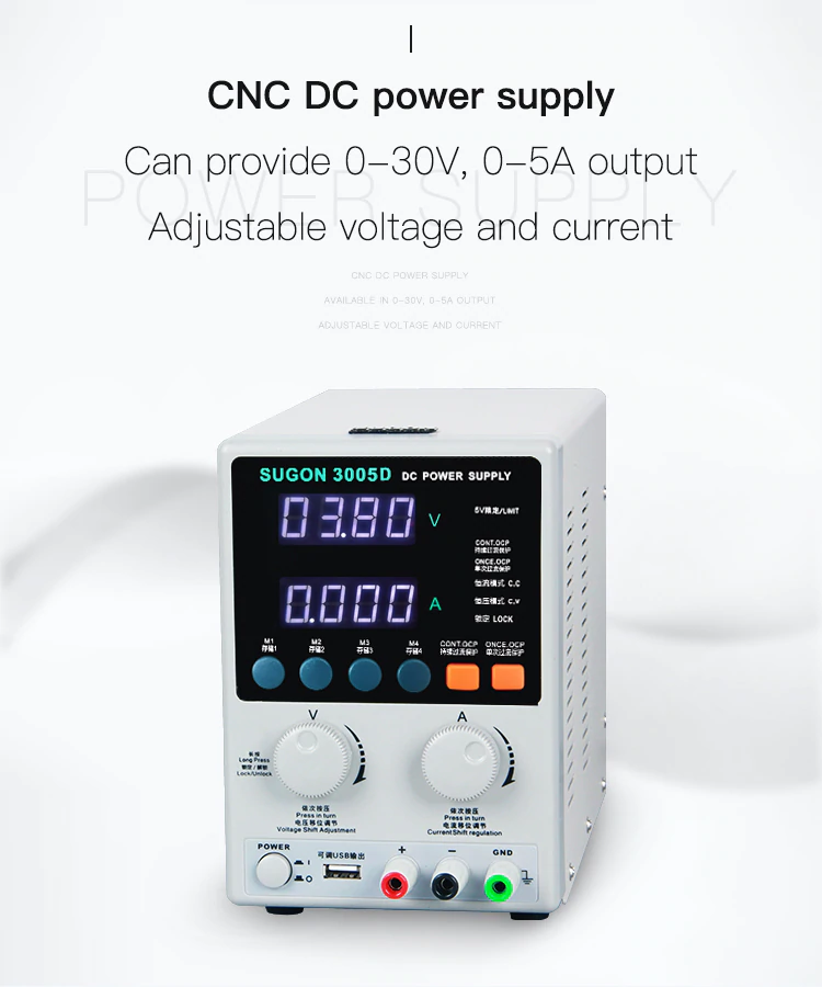 The Sugon 3005D provides an adjustable output of 30V and 5A, allowing users to dial in the exact voltage and current requirements for their projects. It also includes a memory option, enabling users to save and recall frequently used settings quickly.
